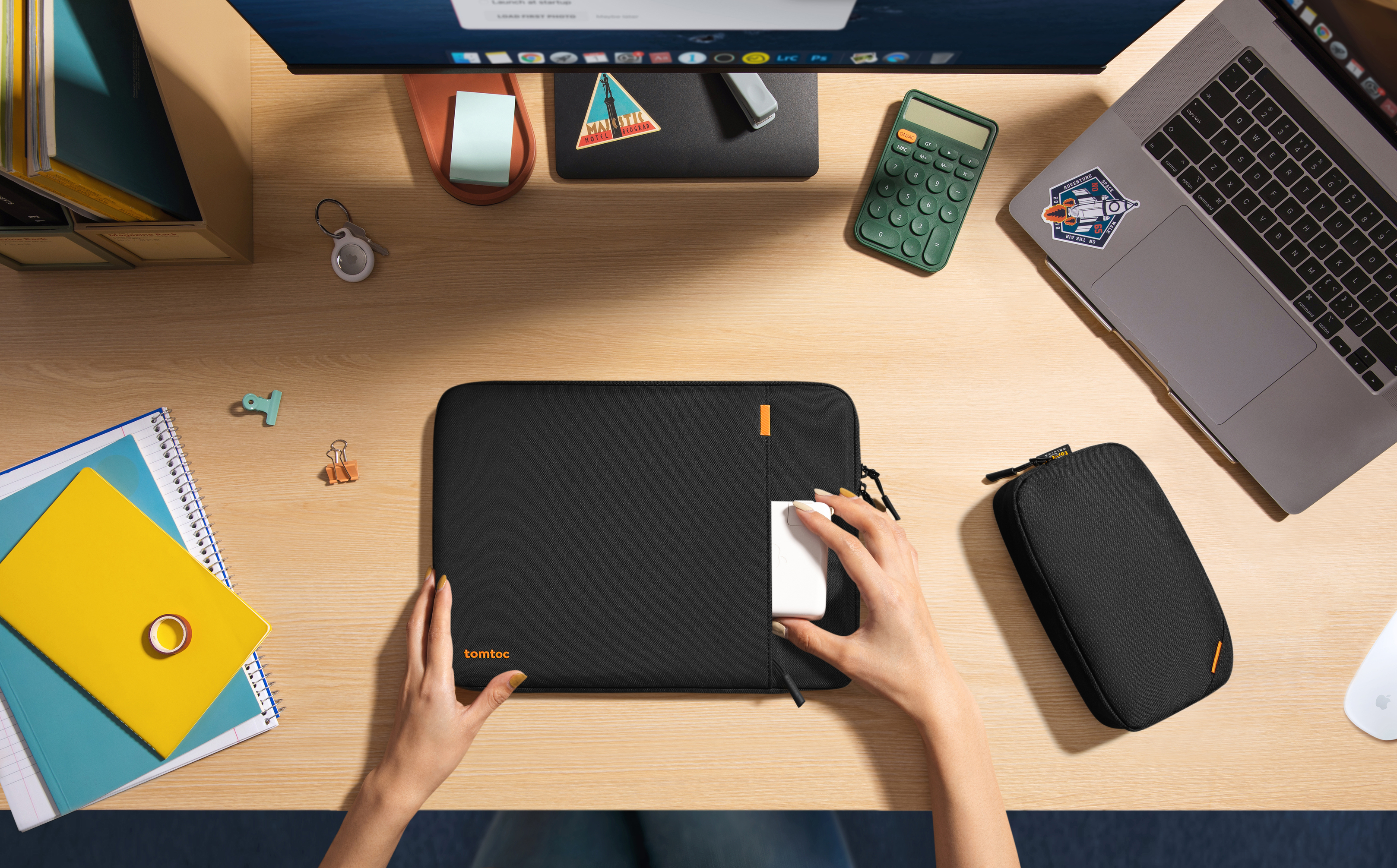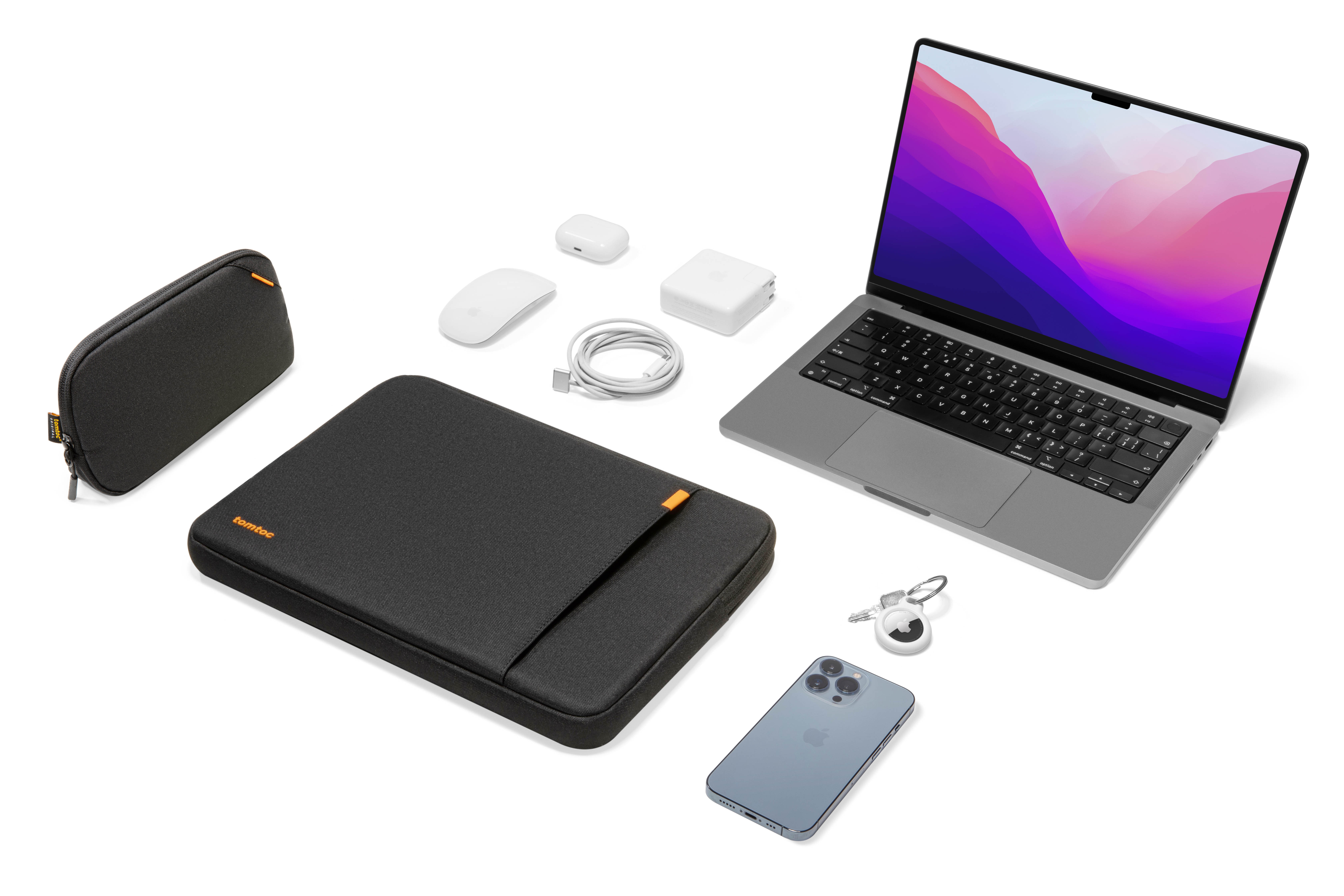 The sleeve comes with an additional small pouch with two mesh pockets in side, lightweight and stylish, which is ideal for keeping your charger, cables, mouse, and other tech accessories safely sorted and neatly organized, right where you need them.
